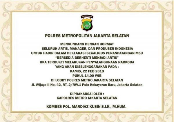Karena itu, Kapolres Jakarta Selatan Kombes Mardiaz Kusin Dwihananto memprakarsai deklarasi sekaligus penandatanganan MoU “Bersedia Berhenti Menjadi Artis” jika terbukti melakukan penyalahgunaan narkoba.