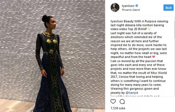 Achintya Holte Nilsen menuju malam puncak Miss World pada 18 November 2017. (Foto: Instagram)