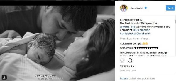 “The First bond // Dekapan Ibu. @ryana_dea welcome to the world, baby Copyright @DieraBachir #childbirthbyDieraBachir,” tulis Diera Bachir, melalui akun Instagram pribadinya @dierabachir, seperti dikutip iNews.id di Jakarta, Minggu (26/11/2017).
