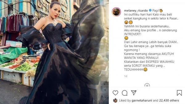 Hal itu tampak di unggahan terbaru fotografer @riomotret di Instagramnya. Dalam foto tersebut, tampak Melaney mengenakan gaun hitam mewah berwarna hitam, lengkap dengan tatanan rambut serta riasan wajahnya yang tak kalah glamor, berpose di tengah pasar.
