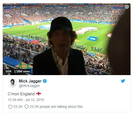 "C'mon England," kata Mick Jagger memberikan semangat kepada timnas Inggris.