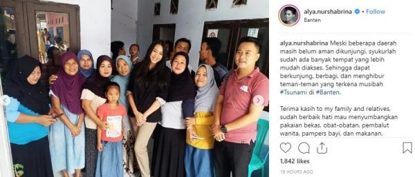 Dalam unggahan tersebut, Alya menampilkan foto bersama para korban bencana, serta relawan di Pandeglang Banten. Tampak senyuman di wajah-wajah mereka yang sempat terkena bencana tsunami yang menghantam kawasan Selat Sunda, termasuk Pandeglang, Banten.