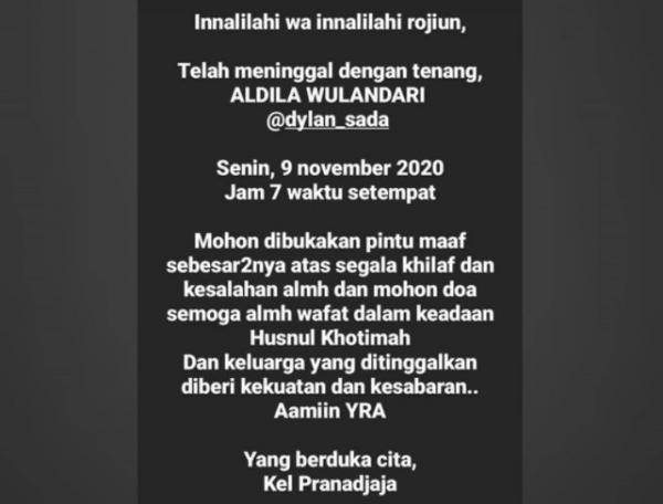"Innalilahi wa innalilahi rojiun, telah meninggal dengan tenang, Aldila Wulandari @dylan_sada. Senin 9 November 2020 jam 7 waktu setempat," tulis Dimas.