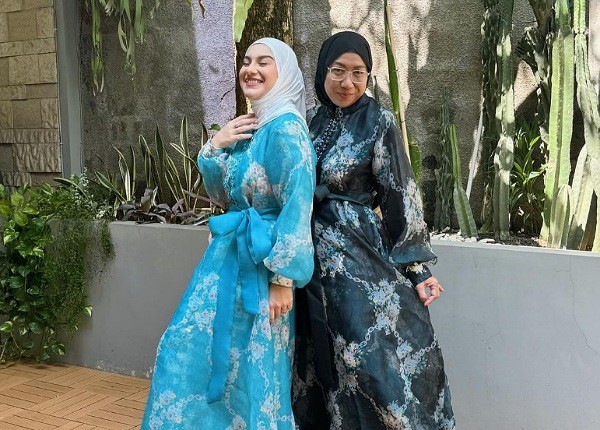 Alih-alih menggunakan outfit shimmer seperti yang sedang tren saat Lebaran, kali ini, Irish justru tak kalah tampil cerah lewat pemilihan warna biru muda nan terang, serta detail gamis yang elegan.