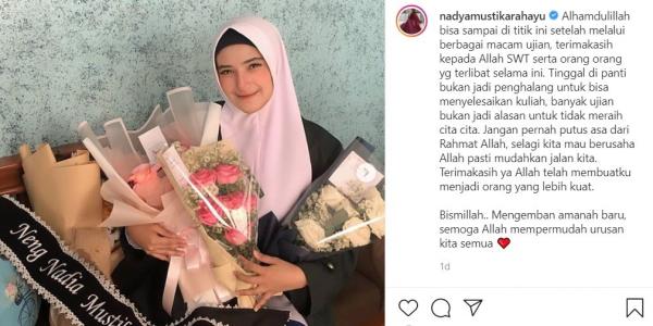Dia pun menceritakan sosoknya yang merupakan anak panti asuhan, tetapi tetap bisa meraih mimpi dan cita-citanya. Nadya berpesan dalam unggahannya agar tak putus asa dan terus berusaha.