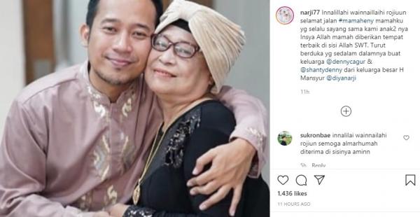 “Innalillahi wainnaillaihi rojiuun selamat jalan #mamaheny mamahku yg selalu sayang sama kami anak2 nya,” tulis Narji seperti dikutip dari keterangan fotonya, Selasa (19/1/2021).