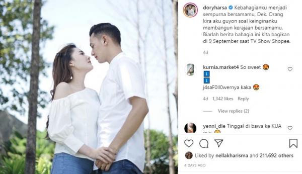 “Kebahagiaanku menjadi sempurna bersamamu, Dek. Orang kira aku guyon soal keinginanku membangun kerajaan bersamamu. Biarlah berita bahagia ini kita bagikan di 9 September saat TV Show Shopee,” tulis Dory Harsa.