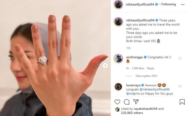 Pengumuman bahagia itu diketahui lewat unggahan di Instagramnya. Nikita mengunggah foto tengah menunjukkan cincin di jari manisnya. Foto tersebut diunggah sehari setelah ulang tahunnya ke-26 tahun pada 29 Juni silam.