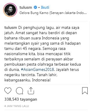 "Di penghujung lagu, air mata saya jatuh. Amat sangat haru berdiri di depan bahana ribuan suara Indonesia yang melantangkan syair yang sama di hadapan tamu dari 45 negara," ungkap Tulus seperti dikutip dari keterangan videonya di Instagram, Minggu (19/8/2018).