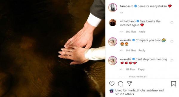 Dalam unggahan Tara Basro tersebut, terlihat dua tangan perempuan dan laki-laki yang kompak mengenakan cincin di jari manis kanan.