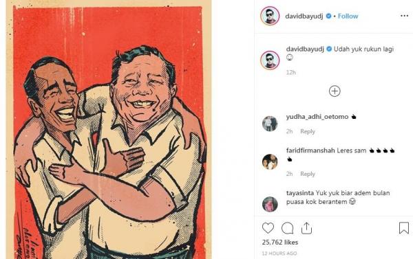 Berbagai seruan untuk damai dan rukun diunggah di media sosial para artis. Seperti yang diunggah oleh vokalis Naif, David Bayu di Instagramnya sebuah gambar Joko Widodo dan Prabowo Subianto yang saling rangkul.
