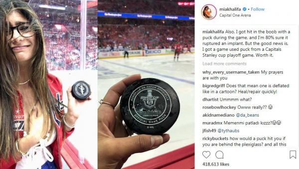 "Aku terkena bola hoki di payudaraku dan itu 80 persen merusak implanku. Namun kabar baiknya, aku mendapatkan bola hoki bekas dari pertandingan Capitals Stanley cup playoff. Sangat berharga," tulisnya, seperti dikutip akun Instagram pribadinya @miakhalifa.