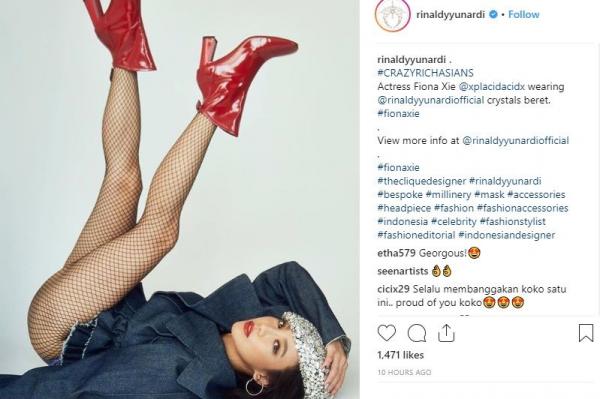 "#CrazyRichAsians Actrees Fiona Xie wearing @rinaldyyunardiofficial crystal beret," tulisnya melalui keterangan foto yang diunggah di Instagram, Selasa (18/9/2018).
