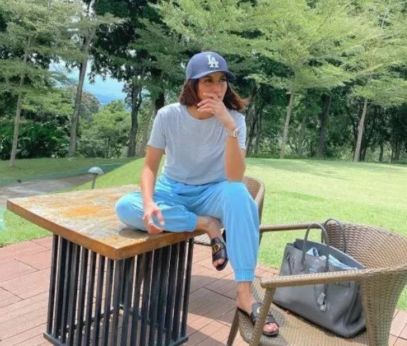 Supaya penampilannya terlihat makin santai, Natasha pun mengenakan sandal hitam. Tak lupa, dia pun mengenakan topi dan jam tangan sebagai penyempurna penampilan. Oh ya, dia juga membawa tote bag bernuansa abu-abu yang cantik lho!
