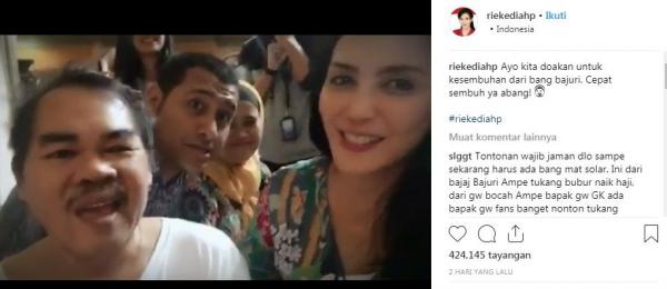 "Hai guys aku sedang sama Bang Juri sama Said. Ada Mpok Minah, Mila, Pak Yadi semuanya. Kita doain semoga Bang Juri cepat sehat. Semangat bang, kuat, sehat, sembuh. Doain ya semuanya," ujar Rieke seperti iNews.id kutip dari akun instagram @riekediahp yang diunggah Minggu (23/9/2018).