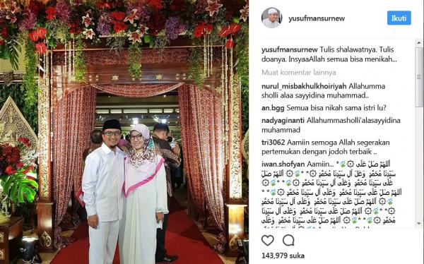 "Didoain semua yang belum menikah, menikah. Tulis shalawatnya. Tulis doanya. Bismillaah. Sholluu 'alannabiyy..." tulisnya lewat akun @yusufmansurnew.