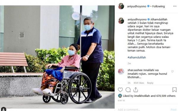 "Alhamdulillah setelah 3 bulan tidak menghirup udara segar, hari ini saya diperkenan dokter keluar ruangan untuk melihat hijaunya daun, birunya langit dan segarnya udara walau hanya 1-2 jam. Terima kasih Ya Allah.... Semoga kesehatanku semakin pulih. Mohon doa teman-teman semua. #alhamdulillah," tulis Instagram @aniyudhoyono dikutip (1/6/2019).
