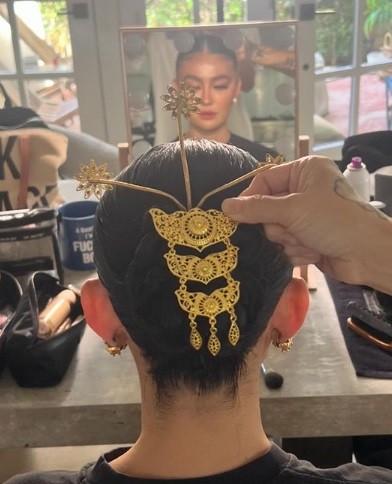 Hiasan kepala itu berwarna emas sehingga memberikan aksen mewah. Tusuk konde jtu juga menambah nuansa nusantara pada outfit Agnez di acara bergengsi ini.