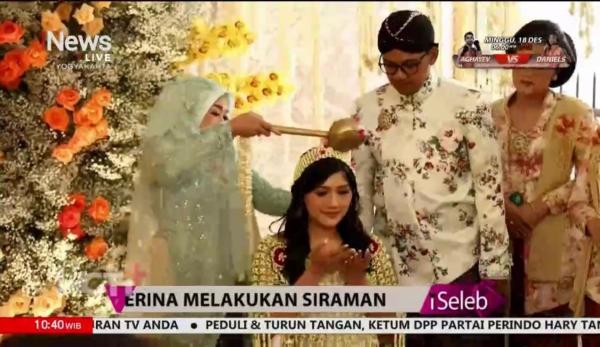 Setelah tangan, air kemudian disiramkan ke bagian kepala. Erina pun tak henti-hentinya tersenyum di prosesi ini. Padahal, sebelumnya dia menangis di momen sungkeman, saat meminta restu kepada ibundanya.
