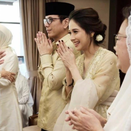 Bersama sang suami, Gista Putri tampak sederhana riasan wajahnya. Dengan alis, eyeshadow warna natural, sedikit blush-on dan lipstik warna nude yang ditambahkan dengan lipgloss.
