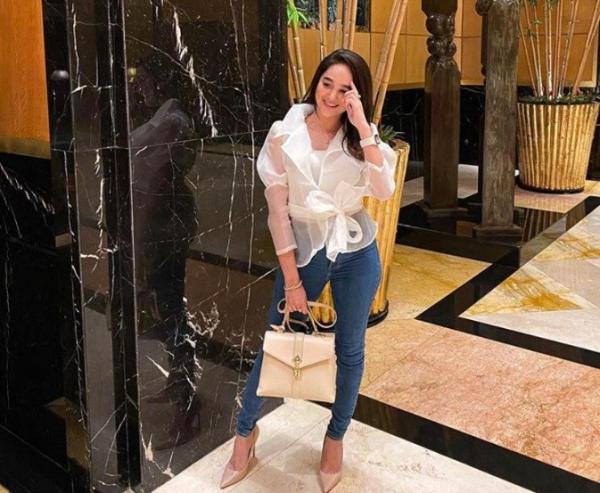 Hana juga tampak berkelas dengan atasan putih dan celana jeans yang dipasangkan dengan sepatu heels dari Christian Louboutin dan tas LV.