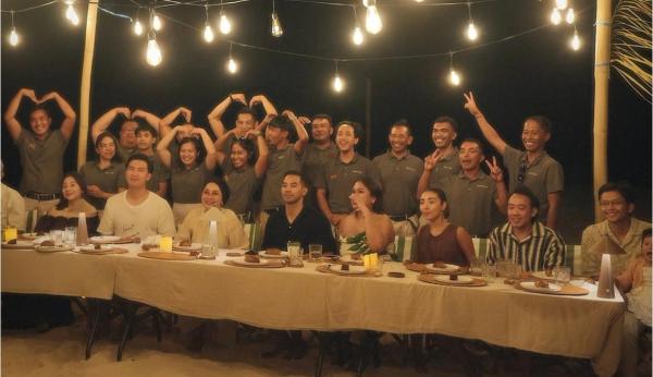 Dekorasi payung jerami dan lampu-lampu gantung yang cantik, suasana makan malam ini terasa sangat eksklusif dan romantis.