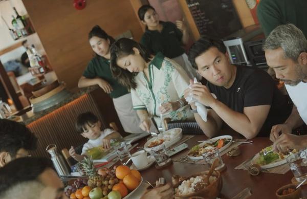 Dalam salah satu momen spesial, Nikita Willy tampak memamerkan kue cokelat di atas piring dalam suasana makan malam mewah di pinggir pantai bersama keluarga besarnya.