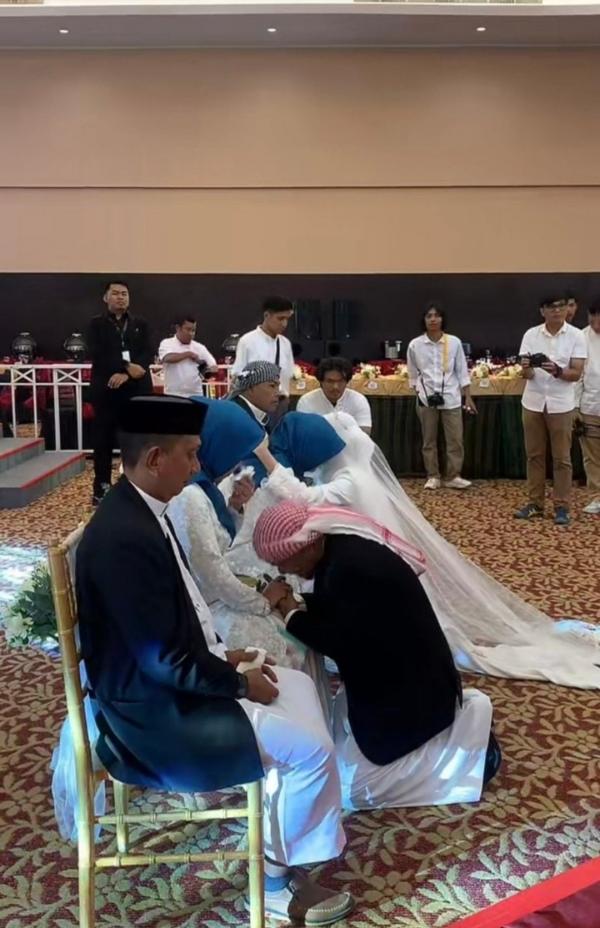 Abdel mengenakan baju Muslim berwarna putih dan menyaksikan langsung prosesi akad nikah sang sahabat dengan penuh khidmat dan kebahagiaan.