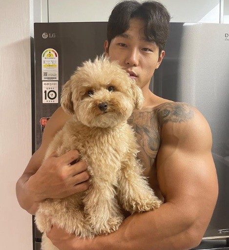 Momen Yun Sung bin saat santai di rumah. Dia terlihat sedang menggendong anjing kesayangannya. Penampilan Sun Bing tentu saja mencuri perhatian karena berfoto tanpa mengenakan baju sehingga otot besarnya begitu terlihat.