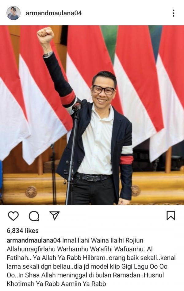 "Innalilkahi wa innalillahi rajiun Allhummagfirlahu warhamhu wa'afihi wa fuanhu.. Alfatihah.. Ya Allah ya Rabb. orang baik sekali kenal lama sekali dgn beliau. Dia jadi klip model Gigi lagu Oo Oo Oo.. In Sha Allah meninggal di bulan Ramadan.. Khusnul khatimah Ya Rabb Aamin ya Rabb," tulis Armand.