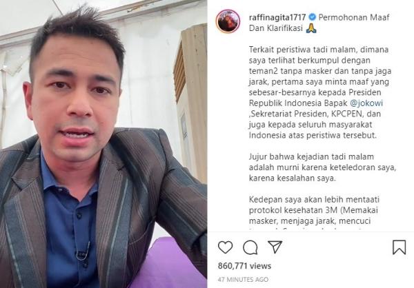 "Permohonan Maaf Dan Klarifikasi. Terkait peristiwa tadi malam, dimana saya terlihat berkumpul dengan teman2 tanpa masker dan tanpa jaga jarak, pertama saya minta maaf yang sebesar-besarnya kepada Presiden Republik Indonesia Bapak @jokowi ,Sekretariat Presiden, KPCPEN, dan juga kepada seluruh masyarakat Indonesia atas peristiwa tersebut,” tulis Raffi Ahmad dalam keterangan video yang diunggahnya di Instagram, dikutip iNews.id pada Kamis (14/1/2021).