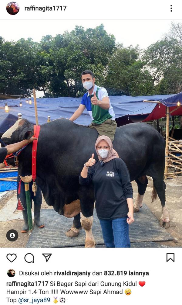 Dalam foto tersebut, Raffi tampak sedang menaiki Si Bager memiliki warna hitam pekat dan sedikit warna putih di bagian kaki dan kepalanya. Raffi, yang mengenakan kaus polo, tampak berada di punggung Si Bager sambil menunjukkan jempol tangannya. “Sapi Ahmad,” tulis ayah Rafathar itu.