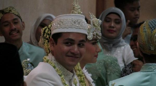 Rizky Alatas mengenakan busana pengantin warna putih lengkap dengan peci. Sementara Adzana memakai kebaya putih dengan bawahan kain batik.