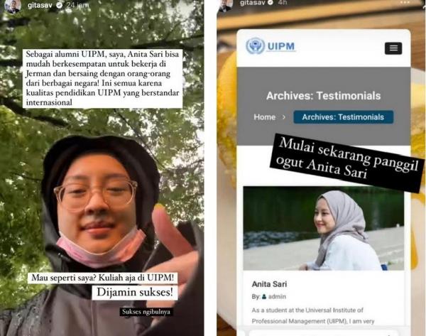 Melalui Instagram Story, Gita Savitri membagikan tangkapan layar yang memperlihatkan wajahnya dicantumkan pada laman UIPM.online di menu testimoni dengan anam Anita Sari.