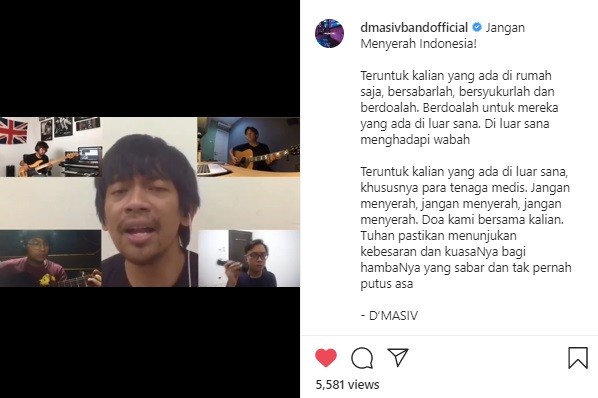 “Untuk tenaga kesehatan yang berada di garda terdepan, untuk para kepala keluarga yang terus berusaha mengais rezeki di tengah kondisi seperti ini.. untuk semua orang yang sedang berjuang bertahan hidup.. ini persembahan dari D’Masiv membawakan Jangan menyerah dari rumah masing-masing,” tulisnya di keterangan video.