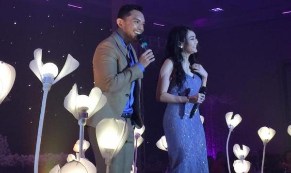 Dalam foto tersebut, keduanya tampak sedang mengisi acara bersama. Rina tampak cantik dalam balutan gaun warna ungu dengan detail brukat yang cantik, sementara musisi asal Brunei Darussalam itu tampak keren dengan setelan jas.