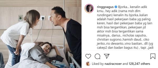 "Pekerjaan jadi aktor msh bisa tergantikan sama misalnya Darius, Nicholas Saputra, Christian Sugiono, Hamish Daud, Chiko Jeriko, Rio Dewanto, Vino G Bastian, dan lain-lain (yang cakep-cakep dan badan bagus itu)," tulis Ringgo sambil bergurau.
