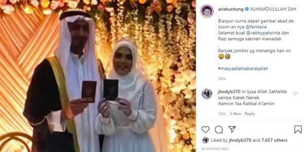 “ALHAMDULILLAH SAH. Biarpun cuma dapet gambar akad de zoom an nya @fenitarie. Selamat buat @vebbypalwinta dan Razi semoga sakinah mawadah,” tulis Arie Untung di media sosial Instagram, dikutip iNews.id pada Sabtu (18/4/2020).