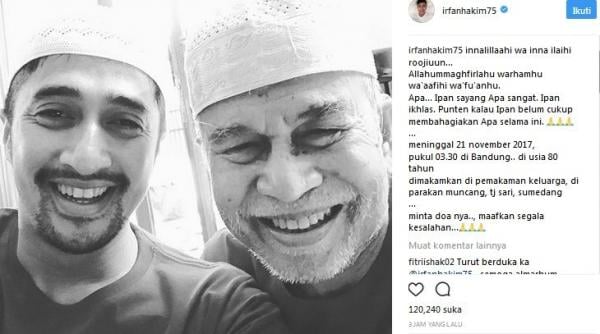 “Innalillaahi wa inna ilaihi roojiuun...Allahummaghfirlahu warhamhu wa'aafihi wa'fu'anhu. Apa...Ipan sayang Apa sangat. Ipan ikhlas. Punten kalau Ipan belum cukup membahagiakan Apa selama ini,” tulis Irfan di akun Instagram @rfanhakim75, sebagaimana dikutip iNews.id, di Jakarta, Selasa (21/11/2017).