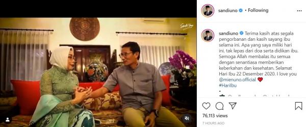 Di media sosial Instagram, Sandiaga mengunggah potongan-potongan video saat bersama ibunda tercinta Mien Uno. Tampak sekali Sandiaga dan ibunda begitu dekat.
