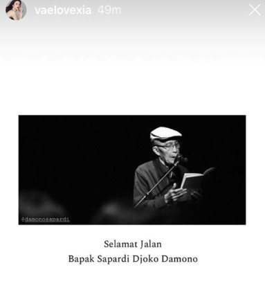 Kepergian penyair 80 tahun tersebut membuat sebagian besar masyarakat Indonesia berduka, tak terkecuali aktris Velove Vexia. Melalui Instagram pribadi, Velove menuliskan ucapan belasungkawa.