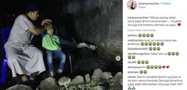 "Alhamdulillah dua hari subuh ini, dia sll slt subuh dan mengunjungi papa @hermanseventeen, dia datang, dia duduk berdoa dengan tegar, tp pas mendekat terasa dia menahan tangisnya," tulis Juliana, seperti dikutip dari Instagram pribadinya, Rabu (26/12/2018).