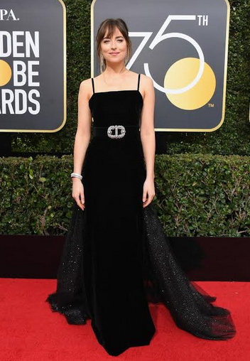 Pemeran Anna dalam serial film Fifty Shades of Grey ini tiba di Golden Globes dalam gaun hitam yang elegan dengan sedikit bling di lingkar pinggang dan taburan kerlap-kerlip di bagian bawah.