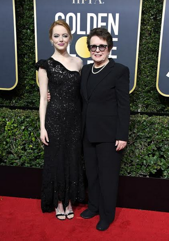 Bintang La La Land ini tampil cantik dan sederhana dalam Golden Globe bersama Billie Jean King, seorang aktivis wanita dan pemain tenis profesional.
