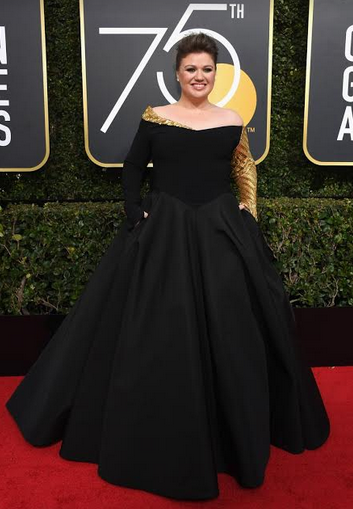 Penyanyi Kelly Clarkson tampil glamour dengan perpaduan warna gaun hitam-emasnya. Riasannya yang sederhana juga menambah pesona pelantun Because of You tersebut.