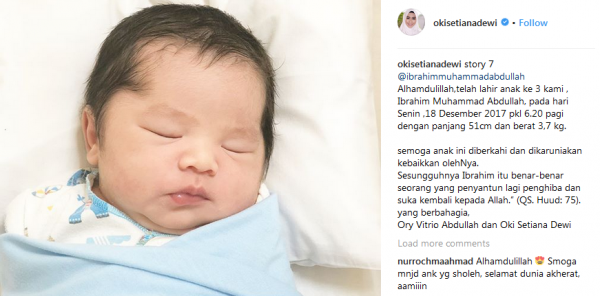 "Alhamdulillah, telah lahir anak ke 3 kami , Ibrahim Muhammad Abdullah, pada hari Senin ,18 Desember 2017 pkl 6.20 pagi dengan panjang 51cm dan berat 3,7 kg.