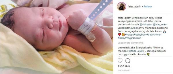 Kabar ini diketahui dari Instagram pribadi ibunda Vicky Shu, Faiza Al Jufri. "Alhamdulillah cucu kedua kesayangan mamake udah lahir," kata Faiza Al Jufri, dikutip dari akun Instagram miliknya, Senin (16/7/2018).