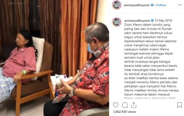 Seperti saat-saat sebelum Ani Yudhoyono atau sering dipanggil Memo wafat. Di momen yang diabadikan istri Agus Harimurti Yudhoyono, Annisa Pohan, Ani tengah menjalani pengobatan di Singapura itu sedang melakukan latihan dengan sepeda statis untuk terapi.