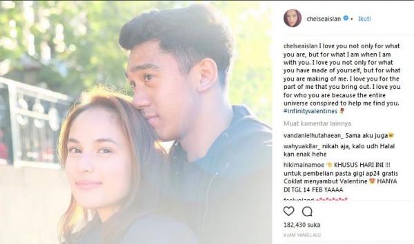 "I love you not only for what you are, but for what I am when I am with you. I love you not only for what you have made of yourself, but for what you are making of me. I love you for the part of me that you bring out. I love you for who you are because the entire universe conspired to help me find you," tulis Chelsea melalui keterangan foto yang diunggahnya di Instagram. Tak lupa, ia menyertakan tagar #InfinityValentines dan ikon bunga mawar.