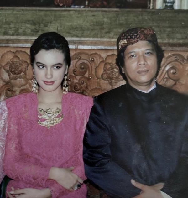 Inilah potret Sophia Latjuba saat remaja. Dia tampil anggun dalam balutan kebaya pink dengan aksesori kalung dan anting. Sementara sang ayah memakai beskap dan blangkon.